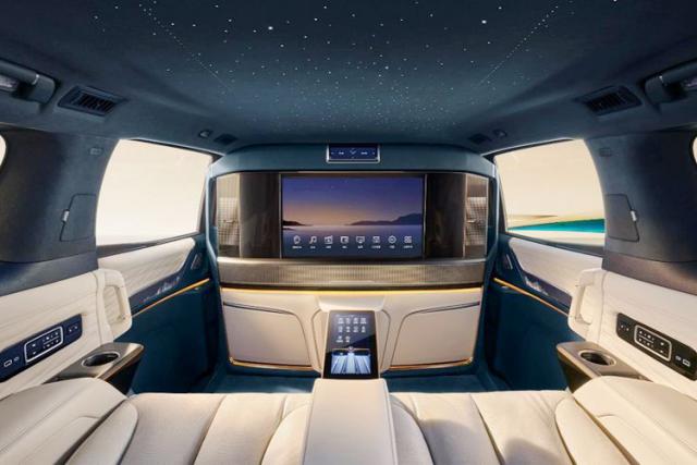 四个私人版本搭载 32 英尺智能幕墙系统可以电动升降。升降后,乘客可以通过摄像头检查前舱状况或欣赏前景;也可以通过前后舱对讲系统进行双向通话。智能幕墙内置悦尊音响系统,配备 2 数字功放,21台 喇叭。压缩机制冷系统也集成在幕墙系统中 13 升降机,弹出式大空间储物箱,瓷器香味,8 配置英尺时钟显示屏等。