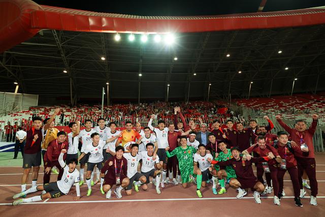 击败巴林队后,国家足球队与看台上的球迷远征军合影