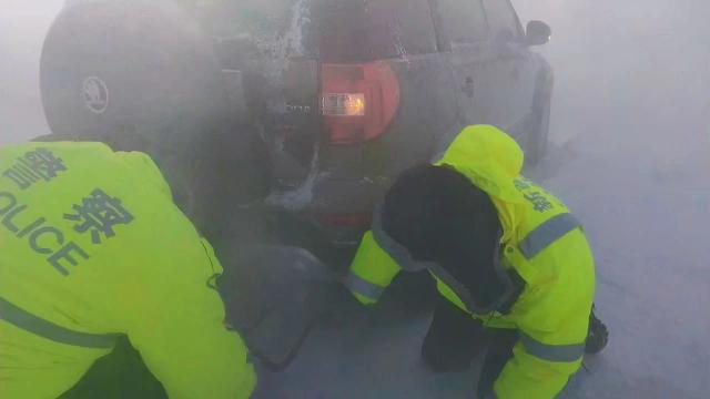 交警联合救援人员通过徒手清雪、人工推车、车辆牵引等方式,引导过往车辆避险,最终成功救出一车四人的困境。