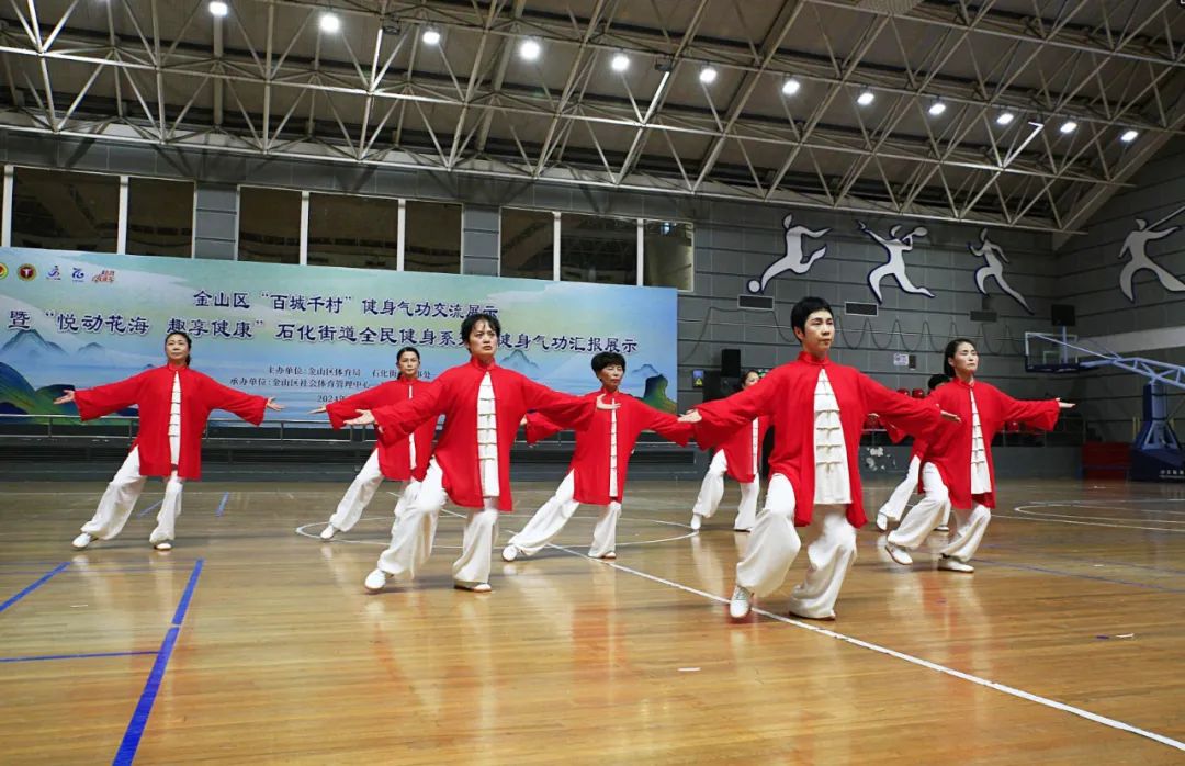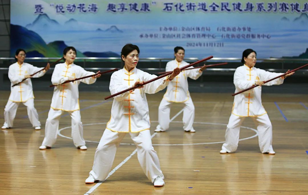 石化街道100多名选手以健身气功八段锦为开场表演。通过精准的呼吸调节和流畅的动作解读,他们展现了健身气功和身心修养的独特魅力。