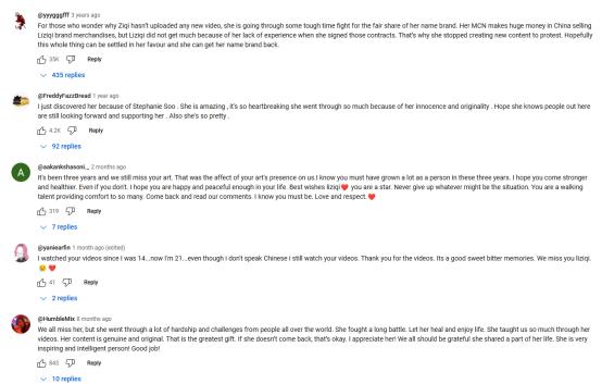 最后一段视频中,网友们都在下面评论,表达对她的思念,等待她的回归。