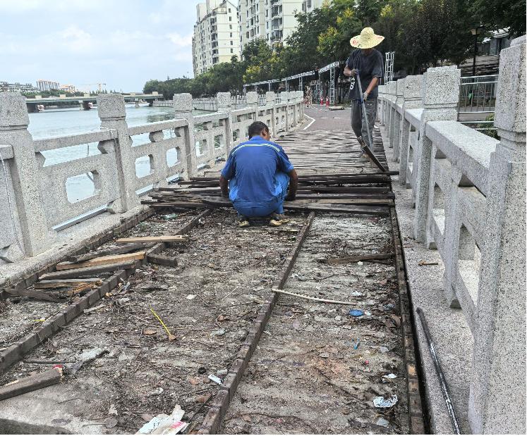 在此之前,居民不愿意带孩子去社区北部的亲水平台玩。“我担心遇到烂木板会摔倒。”很多居民反映,亲水平台靠近社区北门,是周边居民饭后空闲散步的必经之路。但其木地板已经腐烂,存在安全隐患。