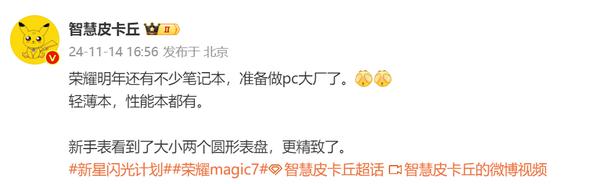曝光荣耀明年将推出多种笔记本 博主:准备做PC大厂。