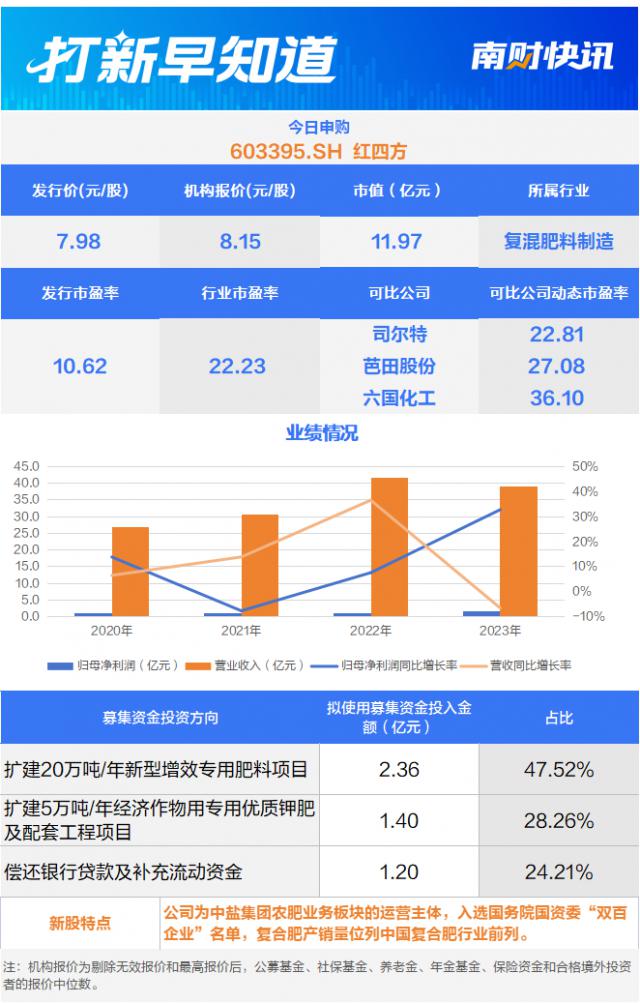 11 月 15 可以认购主板上市的红四方(603395.SH),该公司属于中盐集团,是一家专业从事R&D复合肥和基肥产品生产、销售和服务的化肥生产企业。