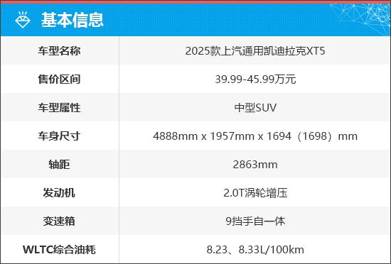 2025 上汽通用凯迪拉克 XT5 通过全新的内外升级,产品实力得到了很大的提升;同时,低至 26.59 限时一口价一万元,也让它成为一款很有竞争力的奢华中型。 SUV。2024 年是凯迪拉克品牌进入中华品牌。 20 周年纪念日,凯迪拉克作为最了解中国用户的奢侈品牌之一,始终坚持中美共享,中美同价。充分考虑自己的产品实力和消费者的实际需求,刚刚上市。 2025 上汽通用凯迪拉克 XT5 有能力再创佳绩,跻身奢华中型。 SUV 市场销售第一阵营。
