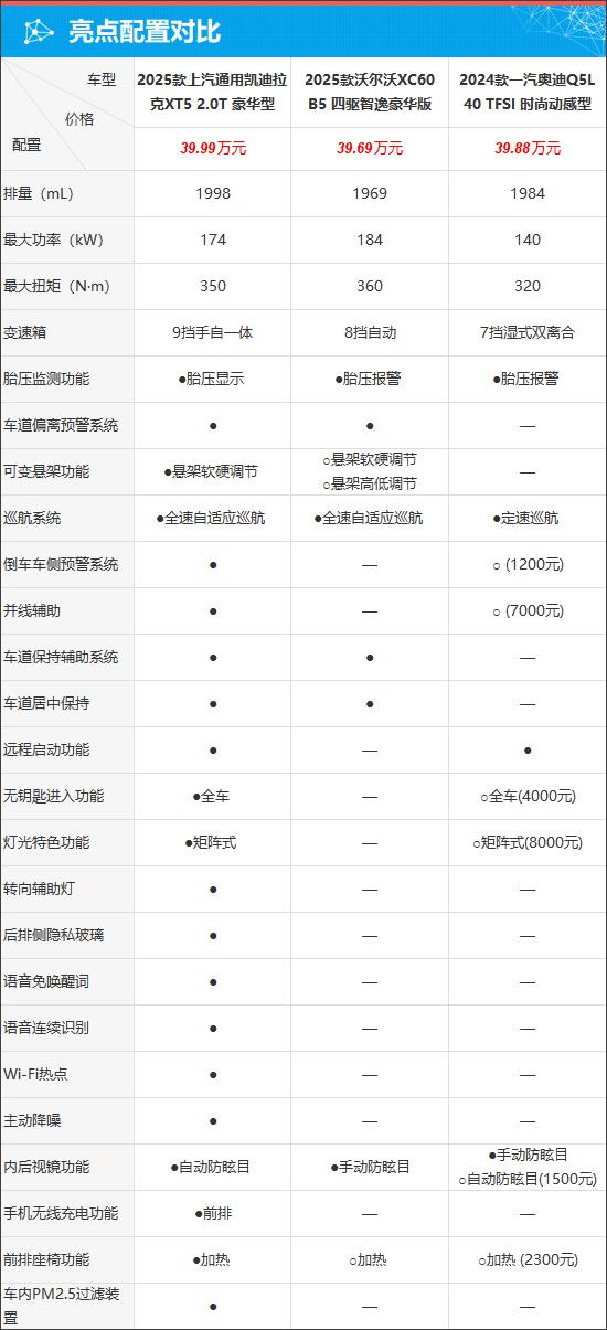 现在的奢华中型 SUV 在市场上,除了德国前三名之外,二线豪华品牌车型还可以凭借良好的产品实力和极具竞争力的价格获得稳定的销量。为了充分考虑价格和产品特性, 2025 上汽通用凯迪拉克 以下简称XT5 XT5)选择了两款竞品车型,分别是 2025 款沃尔沃 XC60(以下简称 XC60)和 2024 款一汽奥迪 Q5L(下文简称 Q5L)。