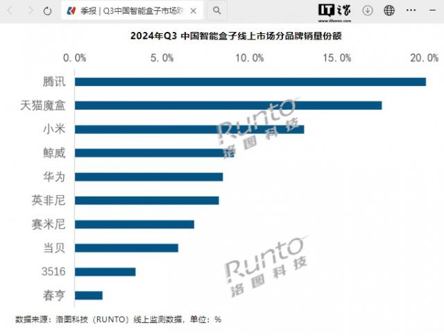 IT 家族从洛图科技获悉,2024 2008年第三季度,中国智能盒在线市场 TOP3 品牌为腾讯,天猫魔盒和小米,合并市场份额为 50.8%,同比 2023 年上升了 2.1 %。