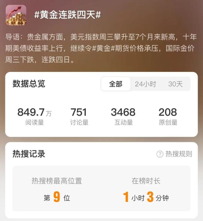 受多种因素影响,今天国际黄金价格继续延续前一天的下跌趋势,跌破每盎司2600美元的关口,黄金价格创下两个月的新低。相关话题#黄金连续四天下跌#一度冲上微博热搜。