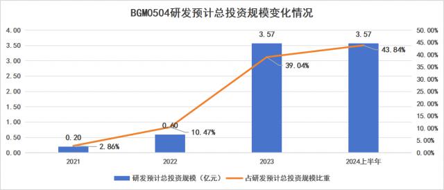 为实现这一目标,博瑞医药迅速增加了R&D的预算和实力。2021年年度报告数据显示 年 BGM0504 研究与开发估计的总投资还只有 2000 万元。但随后的 2022 这一年已增加到 6000 万,2023 一年更是飙升至极 3.57 亿元。约占R&D估计投资总额的比例,也从 2021 年 增长到2.86% 2024 上半年的 43.84%。