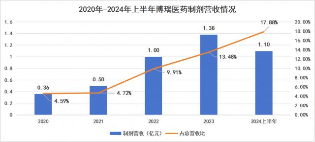通过这种方式,博瑞医药打破了单一的产品收入结构,开辟了第二条曲线。2020 年到 2024 2008年上半年,博瑞医药制剂产品的收入分别为 0.36 亿元、0.50 亿元、1.00 亿元、1.38 亿元和 1.10 亿元,增速分别达到 37.08%、102.46%、37.46% 和 30.38%,主要医药制造业的营收比例由 2020 年 4.59% 增长至 2024 年上半年的 17.88%。