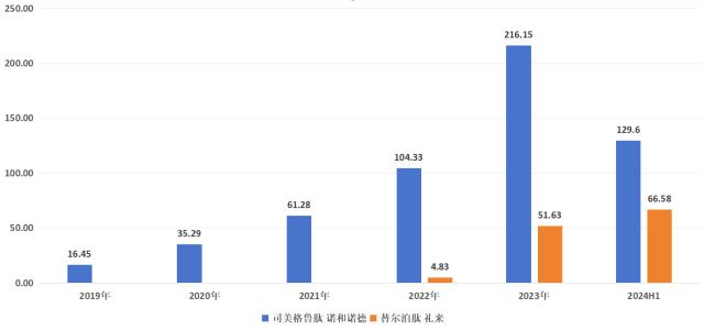 图片:司美格鲁肽和替尔泊肽的销售额(亿美元),来源:锦缎研究所