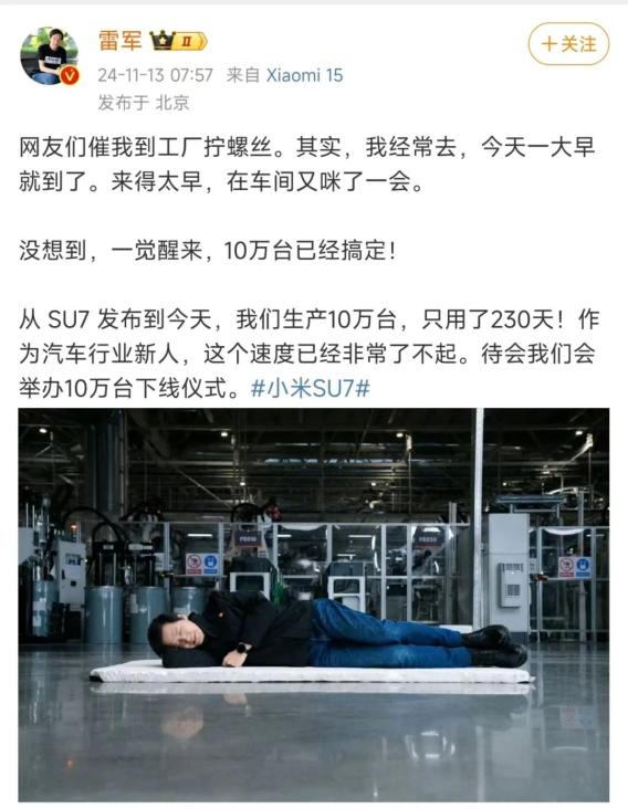 雷军说:“昨天,我们在等10万辆车下线。我们来得有点早,在车间等得有点无聊。我说我们为什么不给我找个泡沫板睡觉?照片真的是摆姿势,让大家开心,不要当真。”