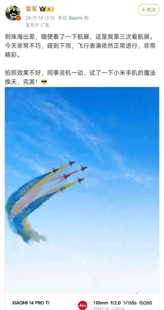 随后,雷军更新了社交媒体动态,称这是他第三次看航展。雷军写道:“我去珠海出差,随便看了一下航展。这是我第三次看航展。不幸的是,今天下雨时,飞行表演仍然顺利进行,令人兴奋。