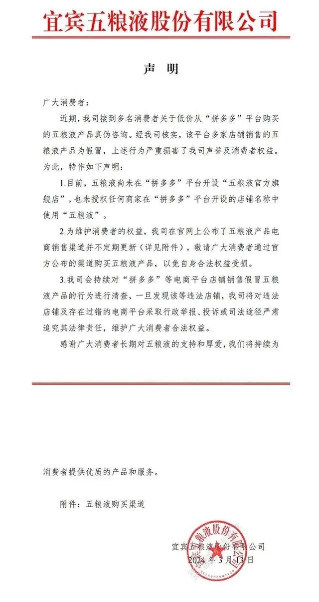 关注白酒行业和电商平台的人,还记得年初五粮液公开发表声明,指责拼多多卖假货的事件。因此,当这个声明出来时,人们很难不去想它。