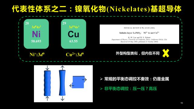 还是要从铜基上去,刚才说铜基超导体的温度是最高的。 163K,铜基能表现出什么样的物理性质?让我们跟着它走,所以我们找到了与铜在化学元素周期表中相比较的镍。