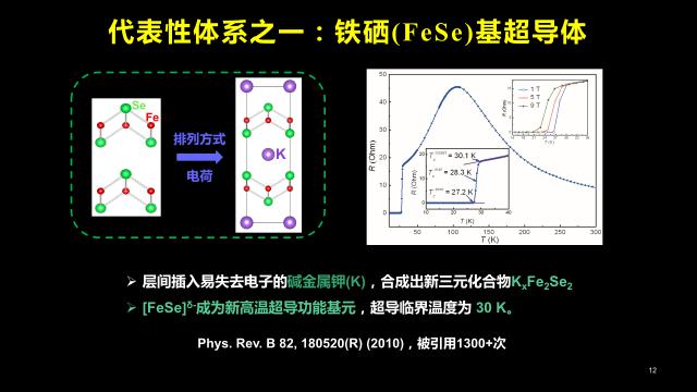当时考虑到这个系统后,我们利用这种在固层中安装离子的方法,生成了一个新的系统,那就是钾-铁。—— 硒三元系统,这个系统的超导临界温度,能看到也是相当高的,从我的角度来看还是相当高的,其实它只是在 30K 从上到下,这也打破了当时整个铁硒基超导材料的最高温度记录,在常压下。
