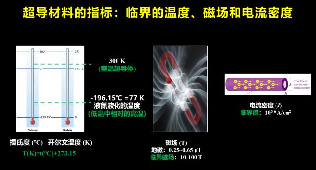 这里有三个指标。一是温度要高。如左图所示,温度要高,尽量达到室温。当然,目前还没有室温超导体。所有已经发现的超导材料的温度都集中在极低的温度区域,基本集中在 10K~100K 它们之间有这样的温度。我在这里说的。 K(开尔文 热门单位),与我们所知的℃不同,它有一个转换公式。