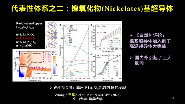 那时是中山大学的王猛老师,他们专注于中山大学。 n=2,一个 La3Ni2O7 这样的系统,他们也在压力,用高压的方法,把这种压力加到很大程度上,可以看到在很高的温度下,大概是在 78K 这种温度下,其电阻出现了很大的下降,但这项工作在当时出现后,引起了国内外的巨大反响,也就是说,我们终于使用了一种不平衡的方法。中国科学家得到了镍基超导体,但遗憾的是,它的电阻没有达到零。我们刚才说的零电阻是超导所必需的。