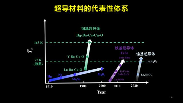从上个世纪对超导材料的向往历史来看, 80 时代,直到 2010 2000年左右,铜基超导体和铁基超导体的出现极大地促进了我们中国科学家在超导材料探索领域的国际地位,也实现了中国超导研究。在世界范围内,它从一个跑步慢慢到一个跑步范围。然后,近年来,我们中国科学家发现了这种镍基超导体系。也就是说,我们中国的科学家,在超导探索领域,目前已走在世界前列。