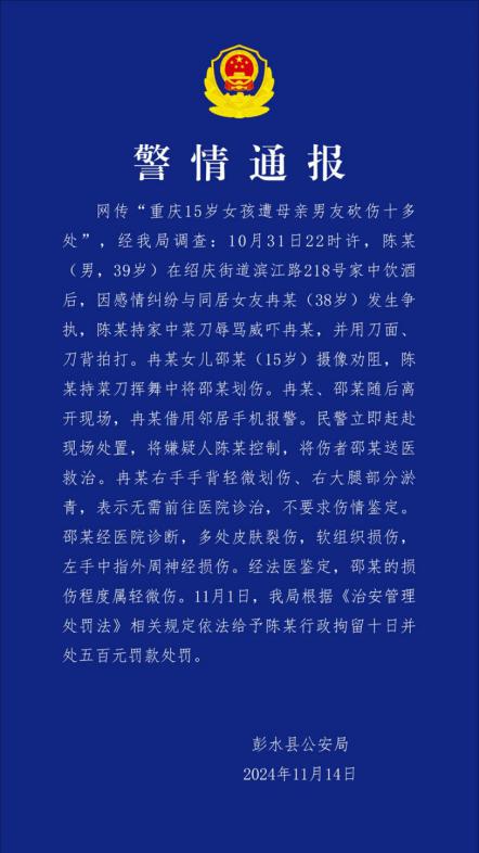 重庆 15 年龄较大的女孩被男友挥刀划伤,嫌疑人被行政拘留。 10 日。