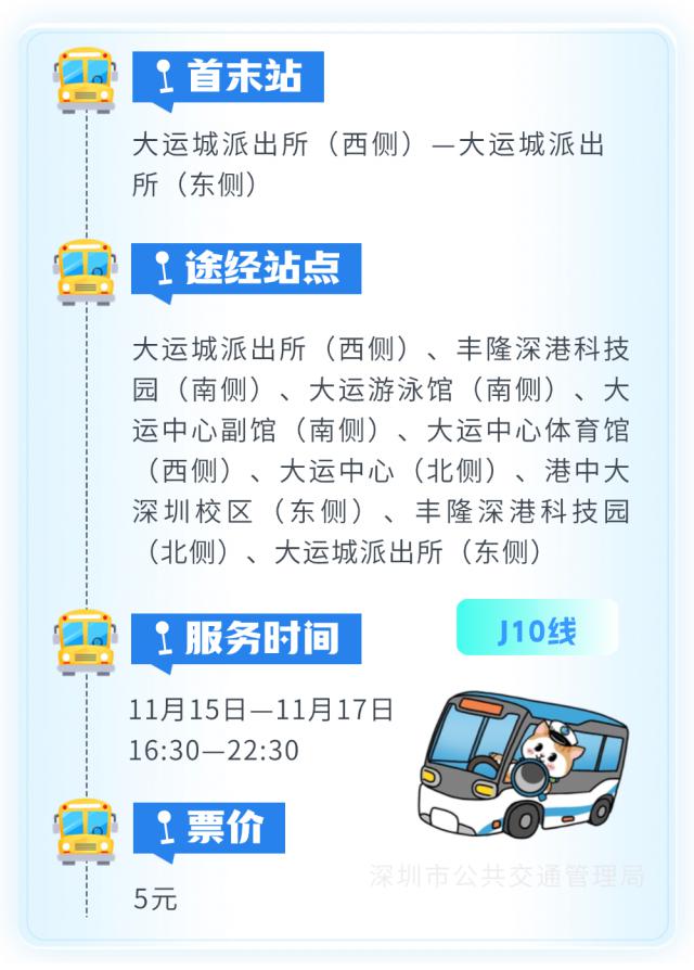 每个人都可以乘坐公共汽车前去包括“大运会中心站”“港中大深圳校区站”“大运会中心体育馆站”等待深圳大运中心周边的公交站台,然后步行到场馆。