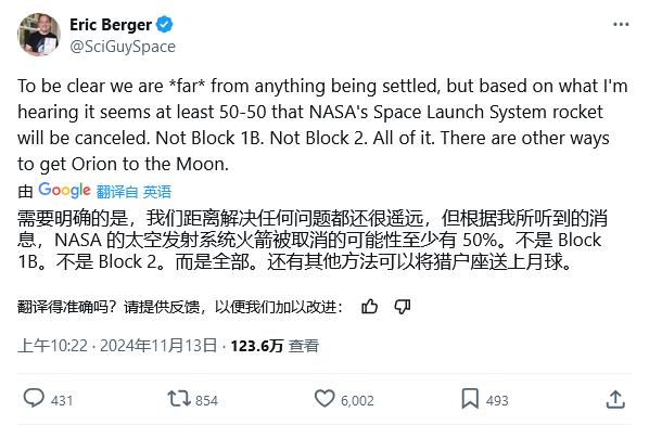IT 世家 11 月 15 科技媒体日新闻 Ars Technica 高级编辑 Eric Berger 于 11 月 13 日在 X 该平台发表了一篇文章,爆料称美国宇航局(NASA)取消空间发射系统(SLS)至少,火箭队的可能性 50% "。