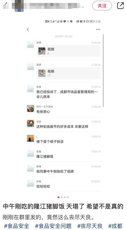 11 月 13 日前,有网友发布视频称,成都一家餐厅疑似回收“水油”,录像显示,一个穿红衣服的女人从垃圾桶里舀出废油,然后端着一锅红油回到餐馆。。有些网民说:“中午刚吃的隆江猪脚饭,天塌了。”