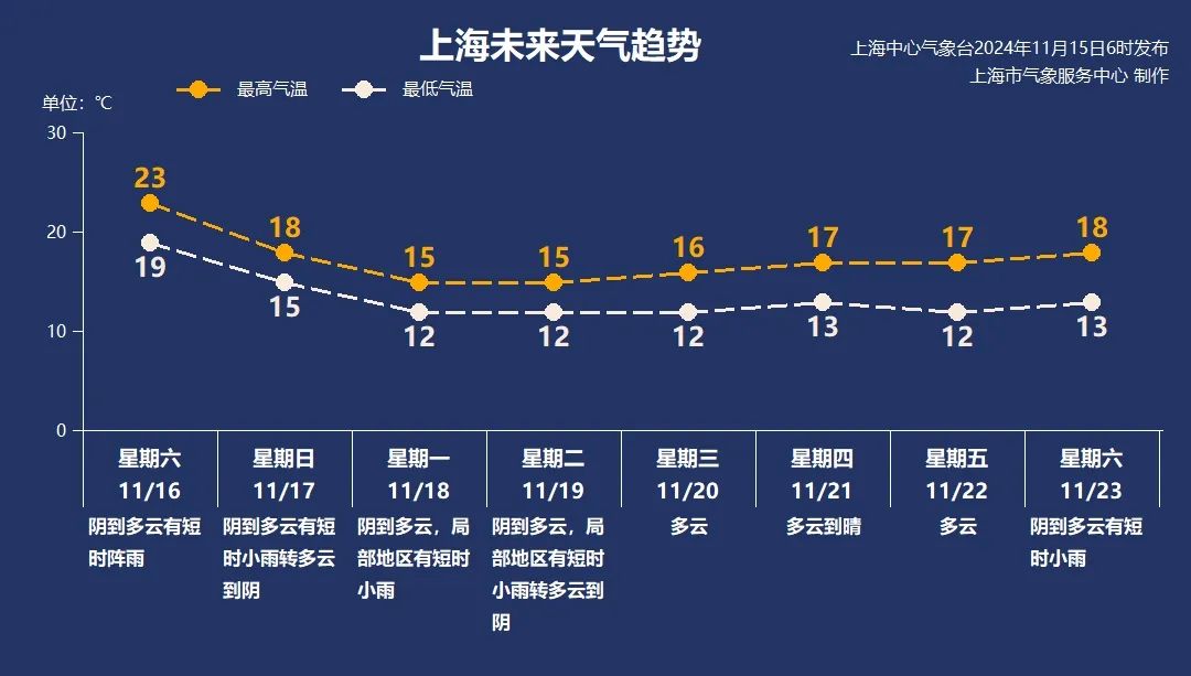 十一月十六日(星期六):从阴天到阴天有短时阵雨,19~23℃