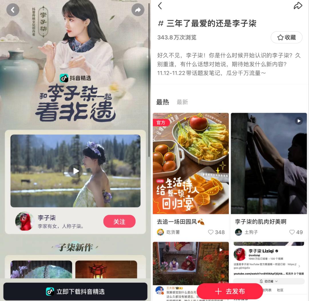 最后,我想提到的是,李子柒没有在任何平台上独家签约。据剁椒Spicy介绍,在隐居三年的时间里,不仅一个头部平台三顾茅庐,还希望邀请“诸葛下山”签署独家协议。但从结果来看,李子柒的复出仍面向全渠道,内容同步发布,主要推广“雨露均沾”。在热度的加持下,各平台也主动进行相关话题或主题合作。比如Tiktok设置了“和李子柒一起看非物质文化遗产”的专属页面,小红书发起了#三年来最喜欢的话题是李子柒,吸引大家积极发帖。