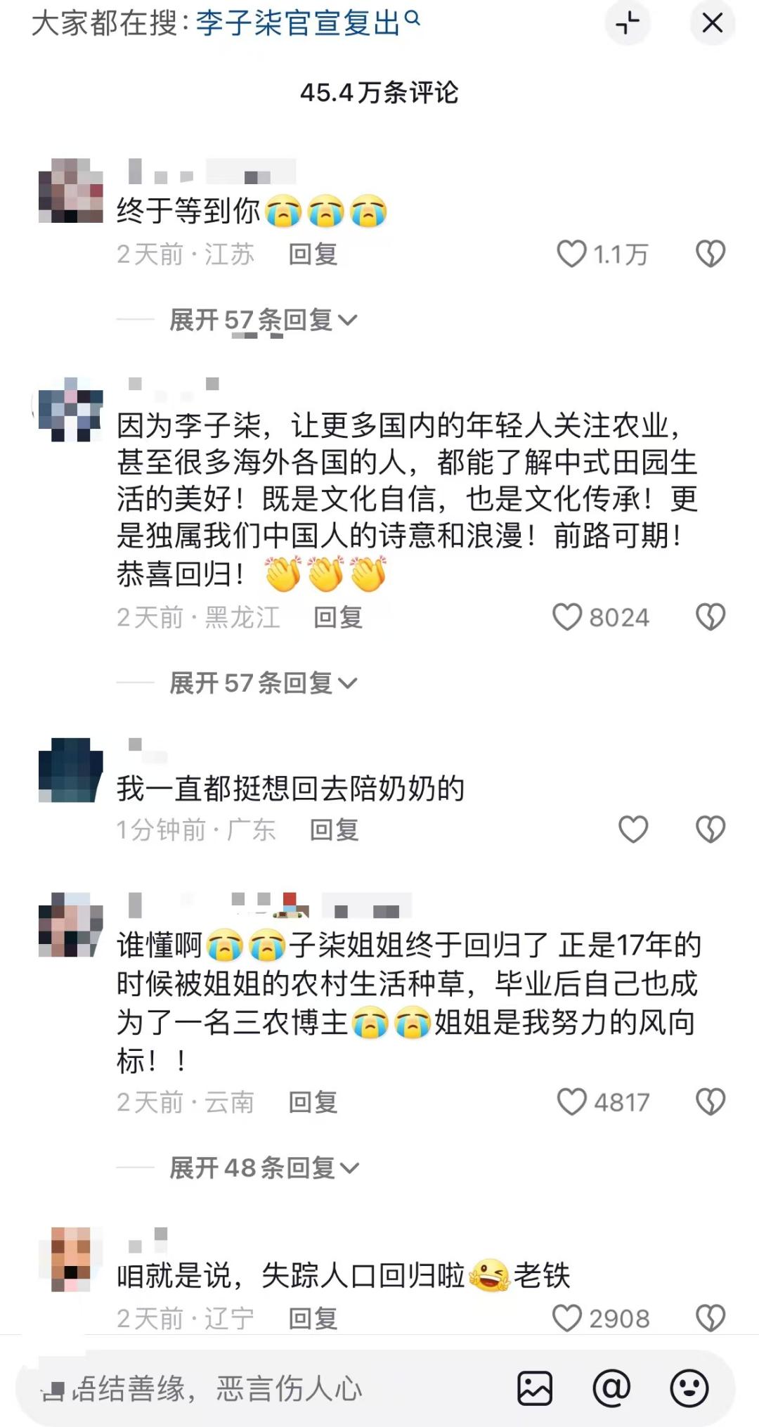 我还记得她停工的2021年,关于李子柒的讨论数不胜数,比如不真实、做作、竞争压力、人气持续等等。然而,这一次,压倒性的赞美和期待成为了主流。