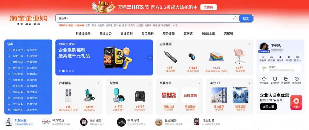双十一期间,《天下网商》采访了淘宝企业购买负责人天德。据天德介绍,淘宝企业在工业品、电子元器件、办公家具、包装、店铺配套设施、定制营销材料、农业农具等领域招募了优质供应,引进了6000多家知名品牌和专业新企业。未来,淘宝企业还将引入更多知名品牌和源头工厂进行采购细分,进一步丰富供给,提高企业客户权益,打造“购买淘宝”的市场心态。