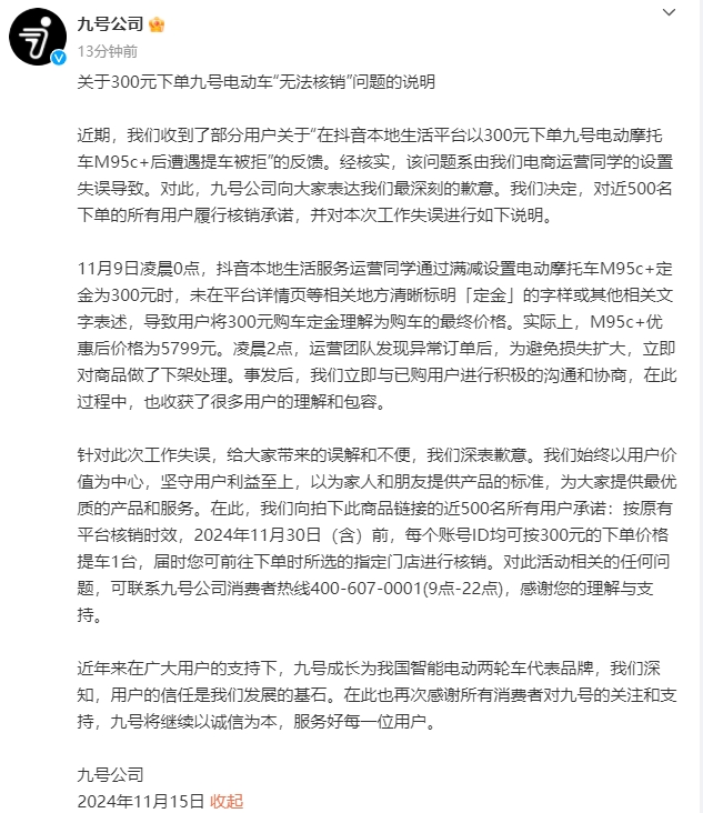 对于这一点,涉案公司官微@九号公司 十五日下午发表声明,经核实,这个问题是由于电子商务运营的设置失误造成的。公司决定按照原平台核销时效,将近500名用户拍下产品链接。11月30日(含)前,每个账户ID可以以300元的订单价格取得一辆车。