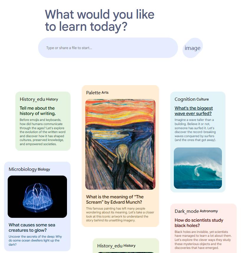 类似于互动电子百科全书,Learn About提供历史、生物学、天文学、体育学等各学科的互动文章和指南,同时可以通过AI自动拓展和深入探索,加速知识学习。