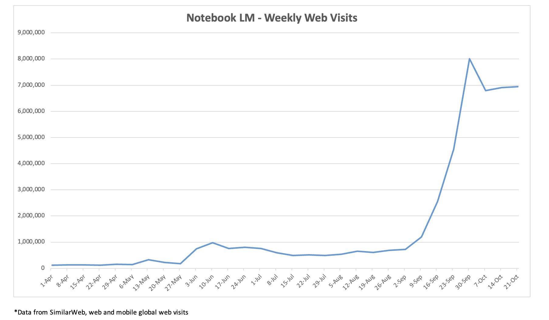 最近两个月,谷歌开发的一款AI笔记产品NotebookLM发展迅速。SimilarWeb数据监控显示,10月份流量增长超过200%,达到9.2M次,比一个月前的3.1M次高出约2个位置,在社交平台上被频繁霸屏,风头无两。