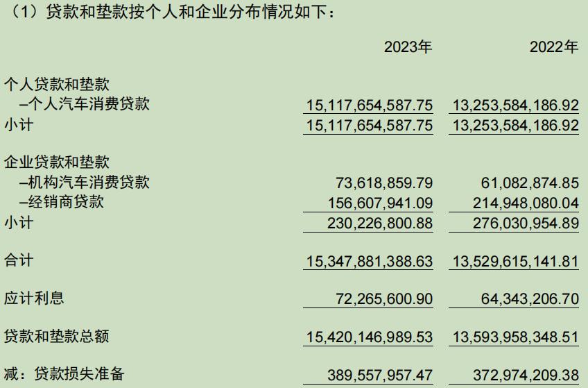 瑞福德2023年年报披露,最初发放个人汽车消费贷款近151.18亿元,共发放贷款和垫款154.2亿元,逾期贷款近4.85亿元;2022年发放个人汽车消费贷款近132.54亿元,共发放贷款和垫款近136亿元,逾期贷款近3.5亿元。
