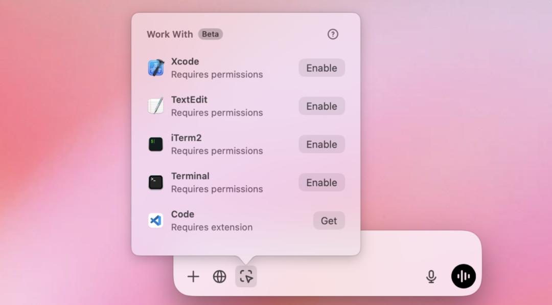 在MacOS版本中,用户可以在ChatGPT桌面上直接启动和操作多个主流编程工具,在不转换应用的情况下,继续编写代码或进行其他工作,从而有效提高开发效率。