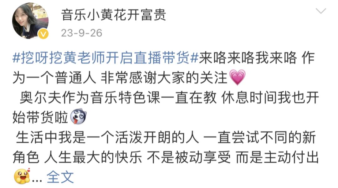 去年9月,黄老师在个人微博上回应带货,说她还在做音乐教育,利用休息时间开始带货,说她是一个活泼开朗的人,一直在尝试不同的新角色。对于有人来说,直播卖货不合适,黄老师也澄清自己不是幼儿园老师,而是某音乐特色课程的参与者。