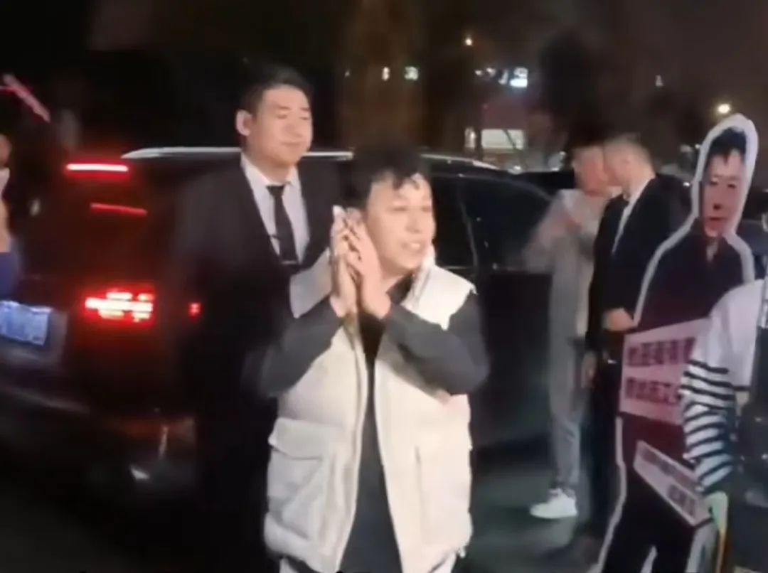 一辆黑色保时捷停在画面中间,门打开了。人群中有人欢呼,喊着“闻神”。砰的一声,伴随着礼花的碎纸从空中飘落,闻会军穿着黑色衬衫,外面穿着白色羽绒背心,在保镖的指导下,他走向了等待他很久的欢迎群体。