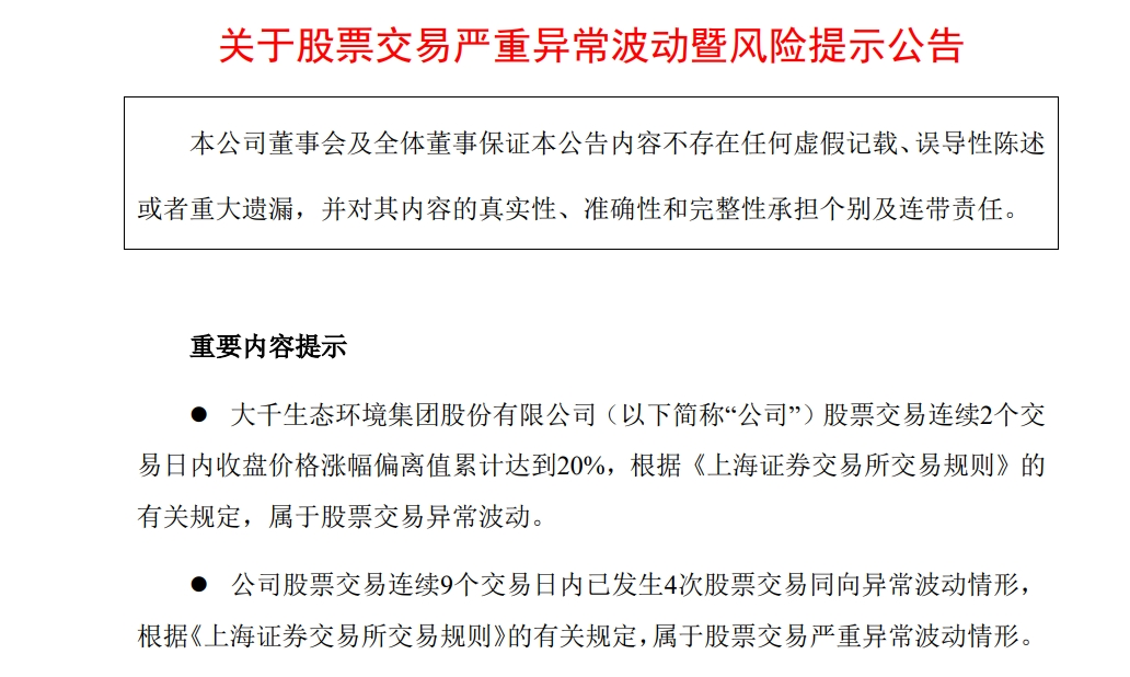 十一月十五日晚,大千生态(603955.SH,股价22.72元,市值30.84亿元)发布股票交易严重异常波动及风险提示公告,2024年11月5日至11月15日,公司股票交易已连续9个交易日涨停。,股票交易同向异常波动已经发生了4次,股价去除大盘整体因素后的实际波动范围较大。