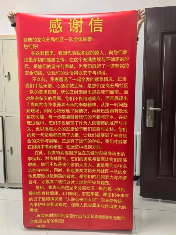 信中深情地写道:“衷心祝愿龙岗分局社区一队的每一位警察身心健康,一切顺利,家庭和睦。愿你在未来继续发扬“人民公安为人民”的光荣传统,为维护社会和谐稳定、保障人民安居乐业做出更大贡献。”