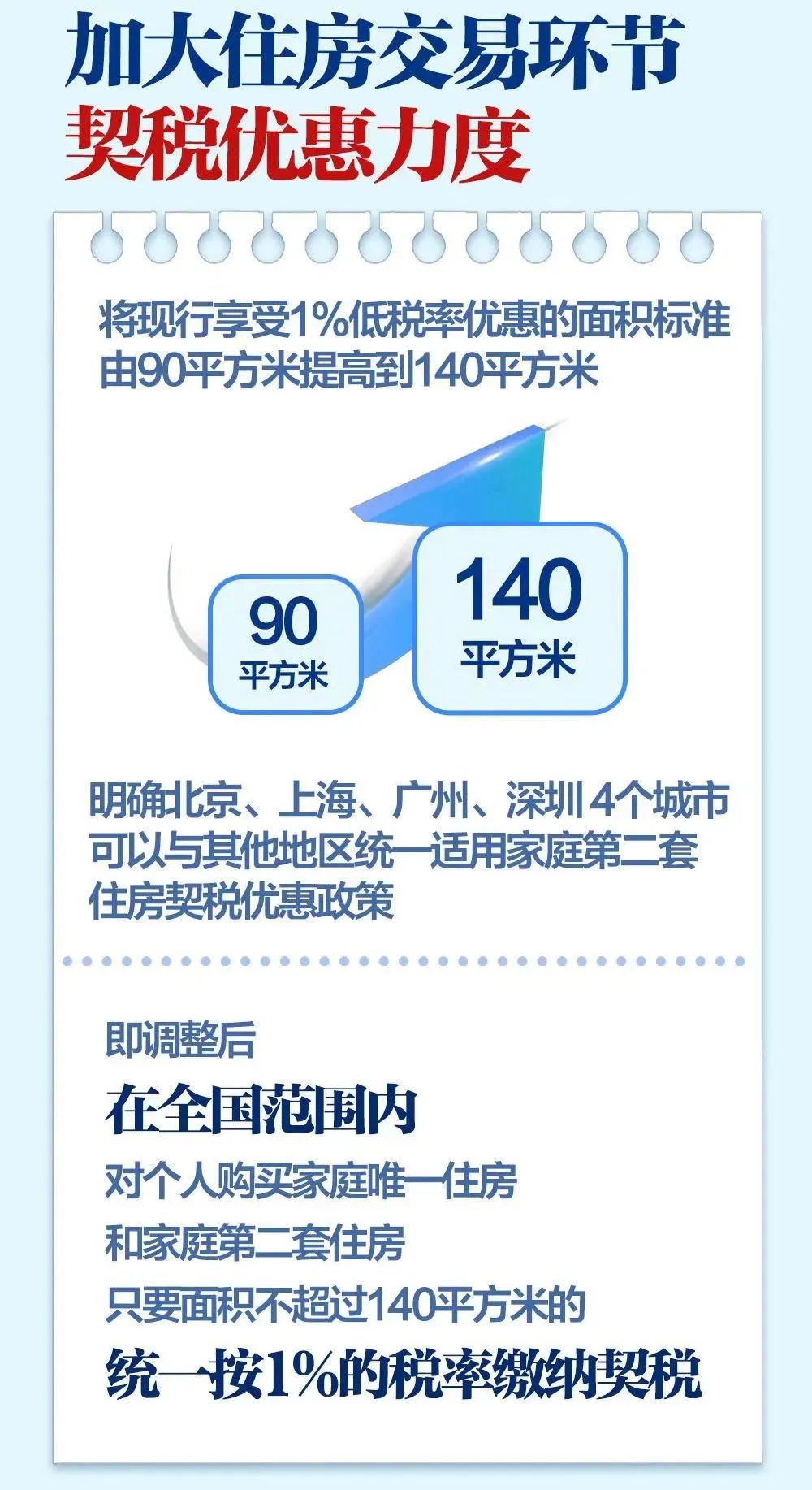 11月13日,三部门发布公告,明确支持房地产市场发展的多项税收优惠政策。提到个人购买家庭唯一的住房和家庭第二套住房,契税按1%税率缴纳,只要面积不超过140平方米。