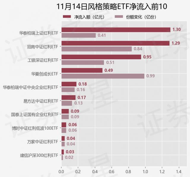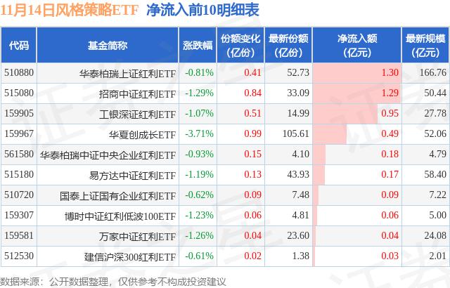 当天有 16 只风格策略 ETF 资金净流入显示,其中华泰柏瑞上交所净流入排名第一。 ETF(510880),份额增加 4100.0 万份,净流入额为 1.3 亿元。