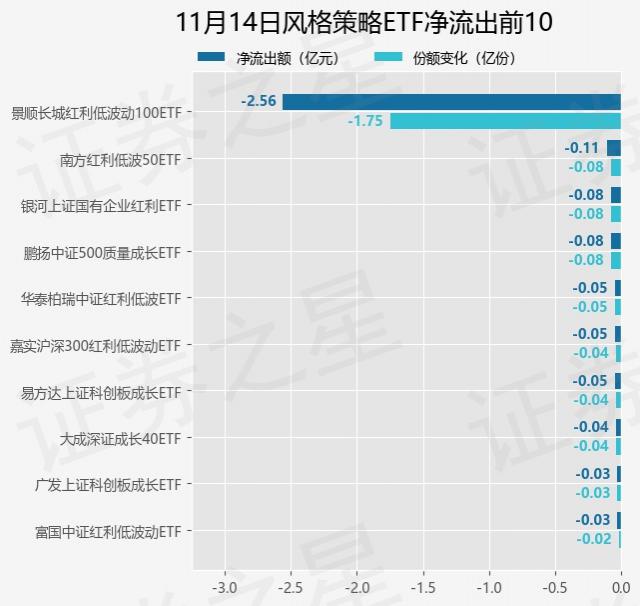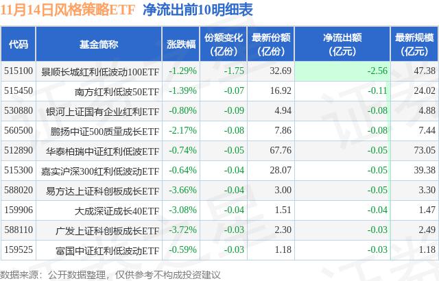 当天有 19 只风格策略 ETF 资金净流出基金,其中景顺长城红利低,净流出排名第一。 100ETF(515100)减少了份额 1.75 一亿份,净流出额为 2.56 亿元。