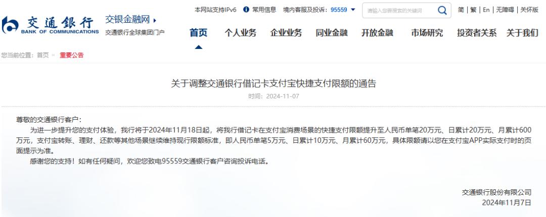 十一月七日,交通银行宣布,从2024年11月18日起,将交通银行储蓄卡在支付宝消费场景中的快速支付限额提高到每笔20万元,每日累计20万元,每月累计600万元,支付宝转账、理财、还款等其他场景继续保持现行限额标准,即每笔5万元,每日累计10万元,每月累计60万元,具体限额以用户在支付宝App实际支付时的页面提示为准。