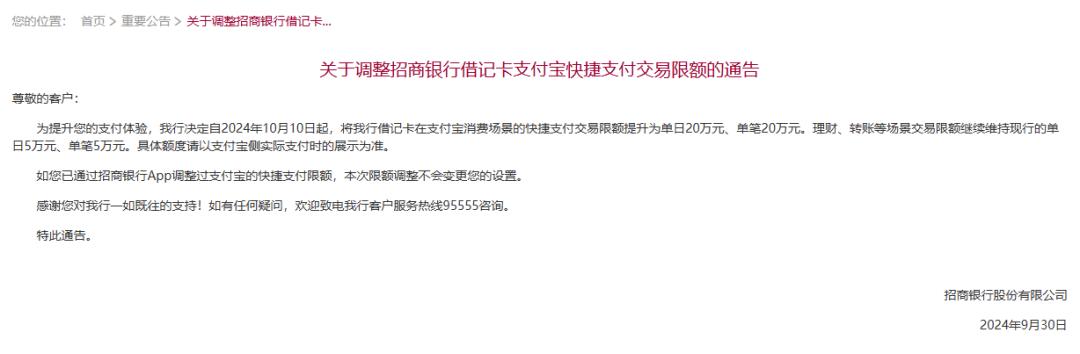9月30日,招商银行发文称,自2024年10月10日起,决定将招商银行储蓄卡在支付宝消费场景中的快速支付交易限额提高到每天20万元和每笔20万元。财务管理、转账等场景的交易限额将继续维持现行每日5万元和每笔5万元。具体金额以支付宝实际支付时的展示为准。