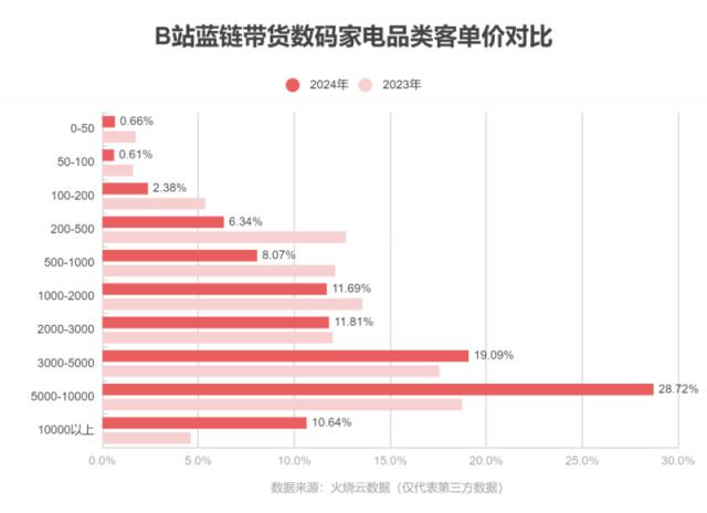 我们能看到 B 站点数码家电单品的客单数量,将5000-10000的那一档打满,是大家消费最集中的区域。