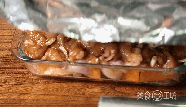 3. 将腌制好的食材铺在蒸碗里,盖上锡纸(或盖上盘子)。