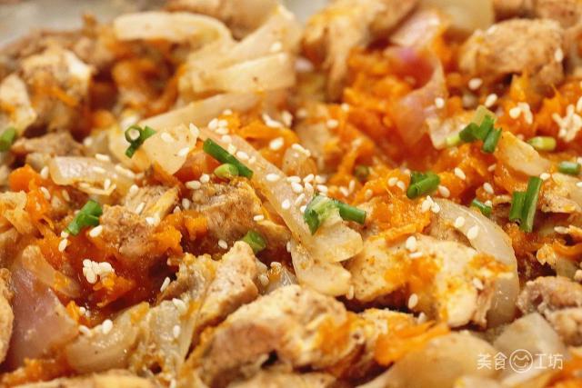 南瓜糖分少,热量低,富含纤维素,鸡脯肉补充蛋白质,葱花补充微量元素,这种减脂餐营养低,容易上手!
