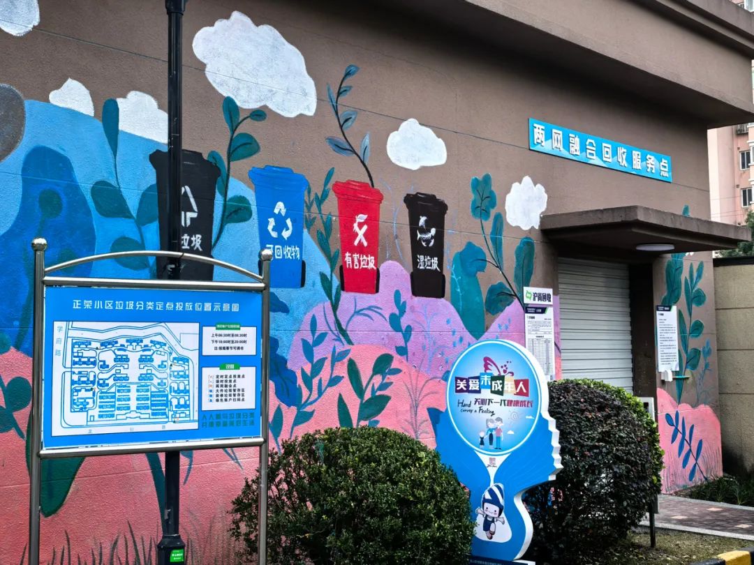 近日,金山卫镇正荣御首都小区生活垃圾分类箱让居民眼前一亮。以垃圾分类为主题的墙绘,改变了垃圾房过去的暗淡形象,为社区增添了美丽的色彩。
