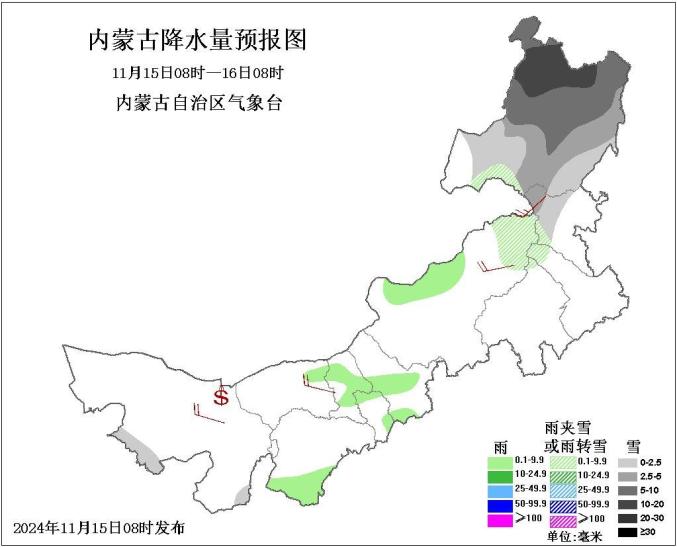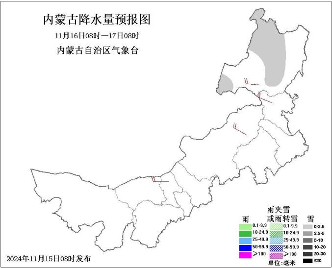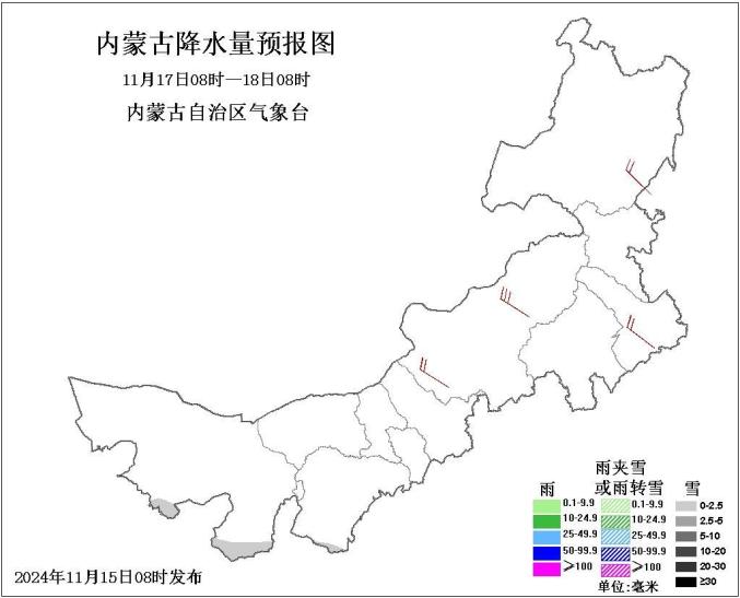 接下来的三天预报如下:15日08时至16日08时,西部偏南偏东,中部大部分阴天,东北部阴天,阿拉善盟南部、巴彦淖尔市东北部、鄂尔多斯市南部、包头市中部和北部、呼和浩特市北部和东南部、乌兰察布市中部和西南部、锡林郭勒盟北部、赤峰市北部、通辽市西北部、兴安盟西部和呼伦贝尔市大多分布不均匀的小雨、雨夹雪或小雪,其中兴安盟西北部、呼伦贝尔市中部和北部有中到大雪。呼伦贝尔市北侧有暴雪,其他地区晴间多云;全区大部分地区4、5级短时6、7级局部地区8级西北风或南风,西部地区西北地区伴有沙尘天气;西部地区北部和东部地区、中部地区和东部地区气温下降6至8℃,西部地区东北地区和中部地区气温下降8至10℃,局部地区气温下降10℃以上。